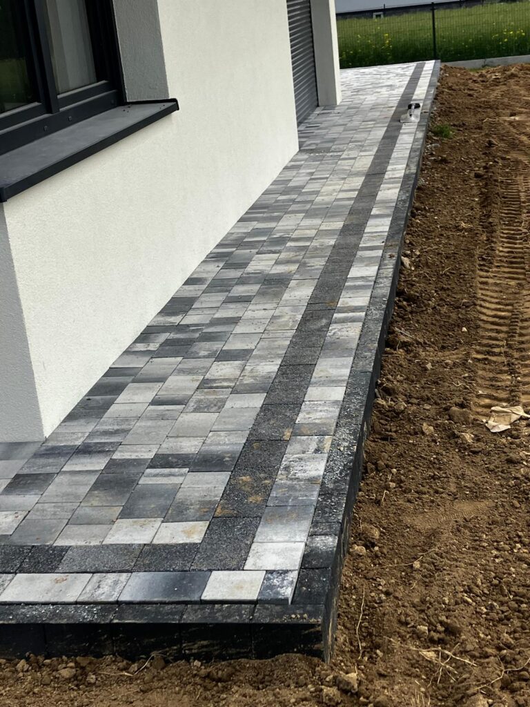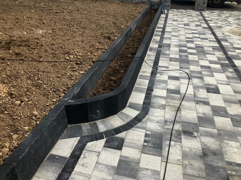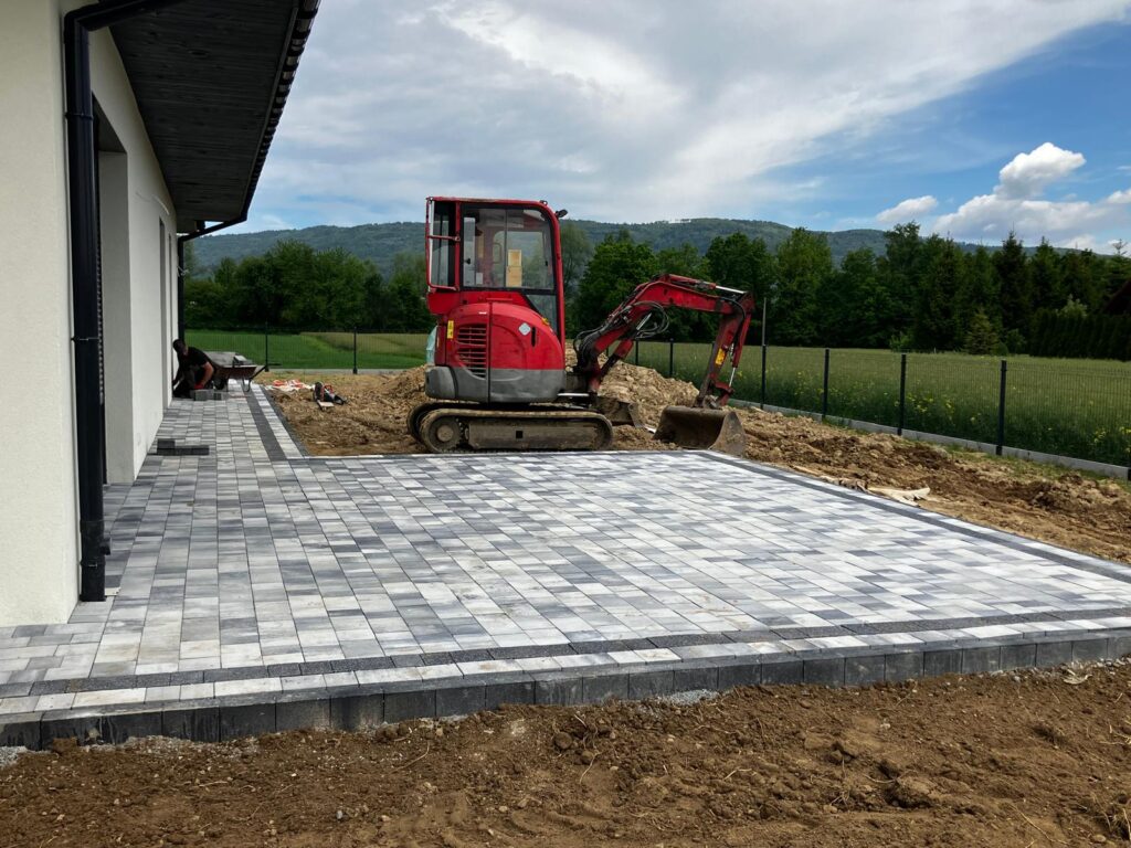 Precyzyjny montaż obrzeży, które trwale wyznaczają granice nawierzchni i zapobiegają rozsuwaniu się materiału.