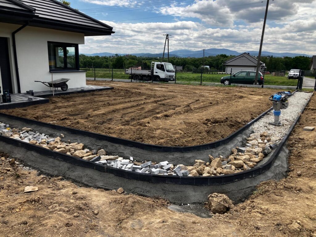Przygotowanie podłoża przez wyrównanie terenu — usuwamy nierówności, aby zapewnić stabilną i estetyczną bazę pod dalsze prace.